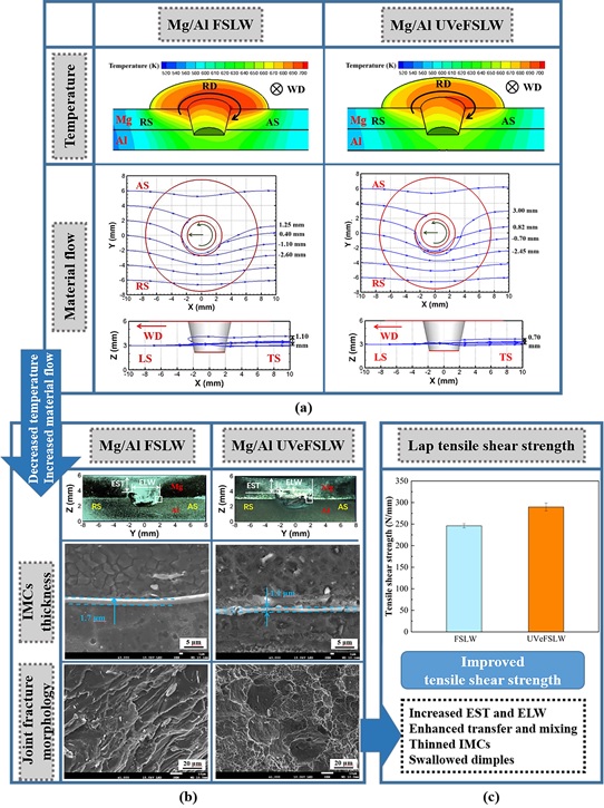 图1 镁/铝搅拌摩擦搭接焊(UVeFSLW)过程中的超声作用机制示意图. (a)搭接温度场和流场; (b) 焊缝宏观金相、金属间化合物和接头断口扫描电镜图像; (c) 搭接接头的拉伸剪切强度