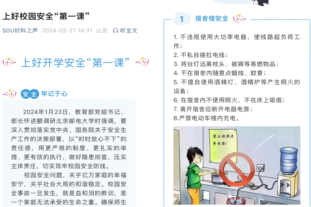 重视安全,筑牢防线。深入学习贯彻习近平总书记关于安全工作的重要指示批示精神,严格贯彻落实学校党委关于校园安全的工作安排。学院通过线上线下结合的年级会议、公众号发布、网站宣传等形式灵活上好开学安全“第一课”,活动重点围绕宿舍用电、电动车安全、实验室安全、防网络诈骗等方面开展安全教育。还通过集体学习《生命重于泰山》《红线》等宣传教育片引导学生将安全意识内化于心、外化于行,助力营造安全稳定的校园氛围。