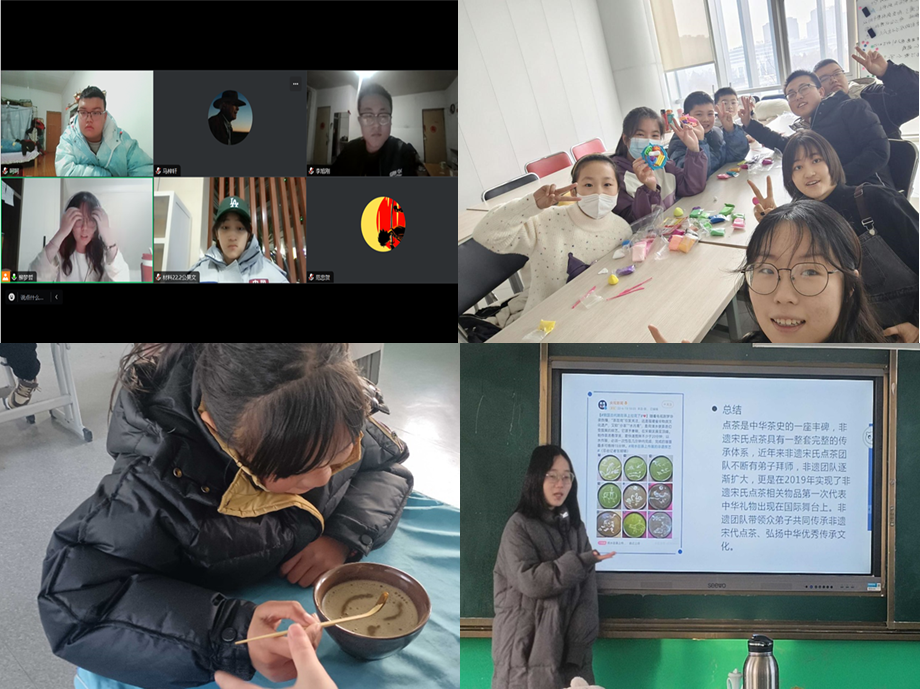 相约走进社区,助力乡村发展。助翔支教团冬令营小队在济宁科技馆与小朋友们共同度过了五天的欢乐时光,为孩子们带来进行多方面的科普启蒙教育,激发他们探索科学的兴趣。小队在前期准备过程中,通过线上会议制定了详细的活动方案和日程安排。在活动开展过程中设计了许多“互动”模块,增加课程的趣味性,增强了小朋友们的体验感。最后,小队还开展了调研活动,了解“双减”政策在当地的落实情况,为活动画上了圆满的句号;为进一步弘扬优秀传统文化,茶文化宣讲社会实践队走进山区,走进校园,为孩子们带来了一堂生动有趣的以“宋氏点茶、非遗点茶茶百戏走进山区校园”为主题的非遗茶文化宣讲课,在丰富了学生假期生活的同时,为乡村教育振兴贡献了自己的青春力量。