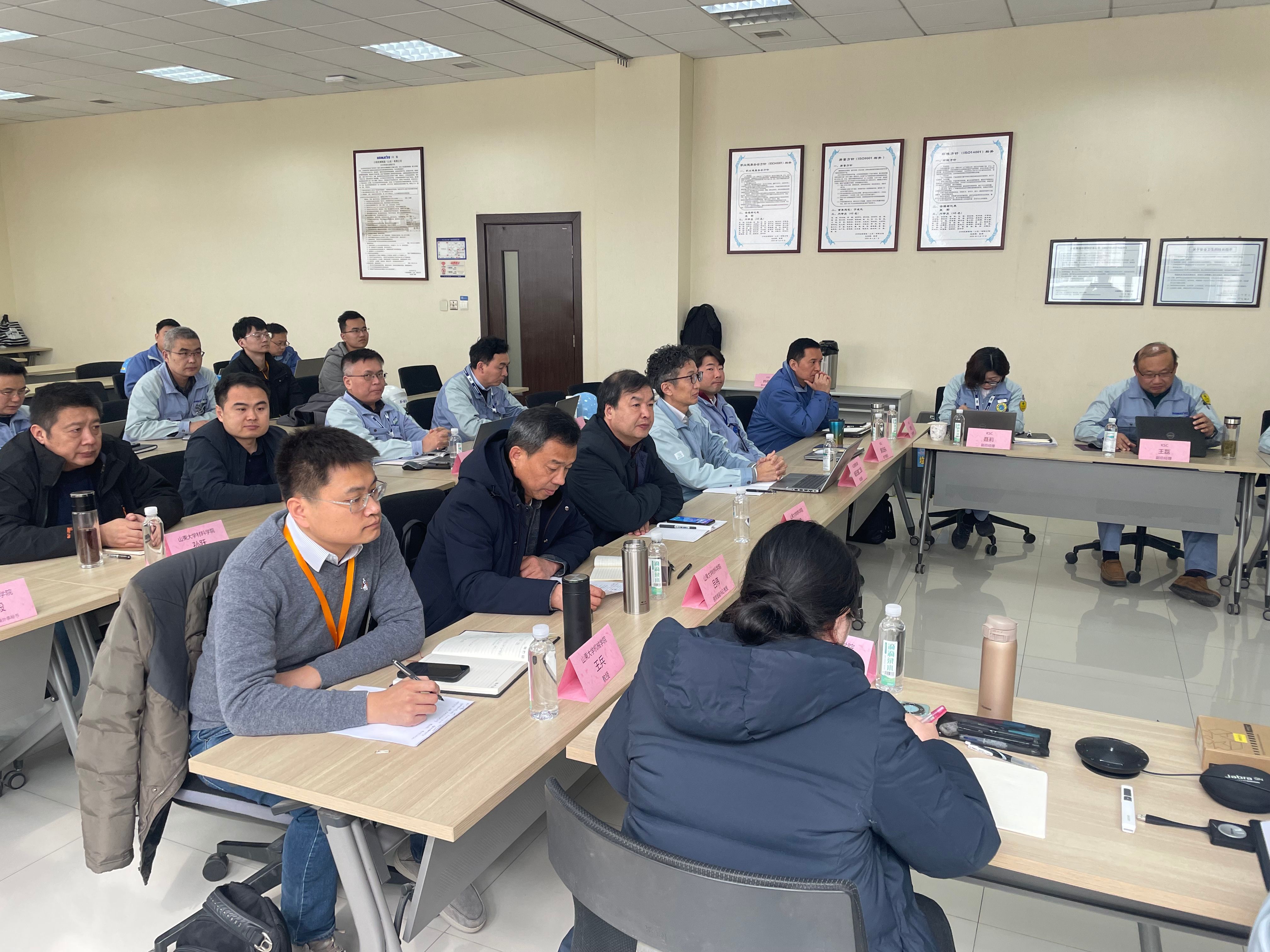 2024年3月6日,小松---山东大学产学研结题报告会在小松机械制造(山东)有限公司召开。山东大学材料学院副院长李辉、原党委副书记吕伟、办公室主任孙跃、外事秘书任钢毅、外国语学院赵艳春同学线下参加了会议,材料学院王桂龙教授、赵新海教授,机械学院王兵教授做了现场结题报告。小松(中国)投资有限公司嶋田健二郎本部长、小松机械制造(山东)有限公司总经理张新、经营顾问我妻毅、副总经理王磊、聂莉等线下参加了会议。小松集团高野史好、福田英俊、山口泰文等线上参加了会议。会议由小松机械制造(山东)有限公司人事教育副科长韩静主持。