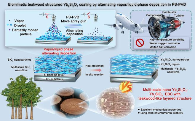 柚木以其卓越的机械性能和环境稳定性而闻名,其独特的层状结构为EBC的开发提供了新方向。韩桂芳教授课题组首次提出了仿生柚木结构的概念,巧妙利用YbDS的分解挥发,并创新性地开发了气/液相交替沉积技术,实现了仿生结构的精确调控,为EBC的设计和制备开辟了新的可能性。通过等离子喷涂-物理气相沉积(PS-PVD)过程中的气/液相交替沉积,回收并调节了YbDS在喷涂过程中挥发的SiO2的沉积与生长,在随后的热处理中实现了SiO2与分解相Yb2SiO5(YbMS)的原位反应,优化了YbDS涂层的纳米结构和组成,最终成功制备出具有仿生柚木层状结构的多尺度纳米YbMS-YbDS复合EBC,实现了涂层结构的创新设计。该项研究不仅提升了材料的利用率,也为EBC的制备带来了全新的视角,为类似挥发特性的喷涂粉末制备涂层提供了新的设计策略和方法。此外,研究也为燃气轮机引擎等高温应用领域提供了创新的防护策略,预期将大幅提高涂层的机械性能和耐腐蚀性,实现在高温环境下的长期稳定保护,展现仿生结构在高温涂层应用中的广阔潜力。