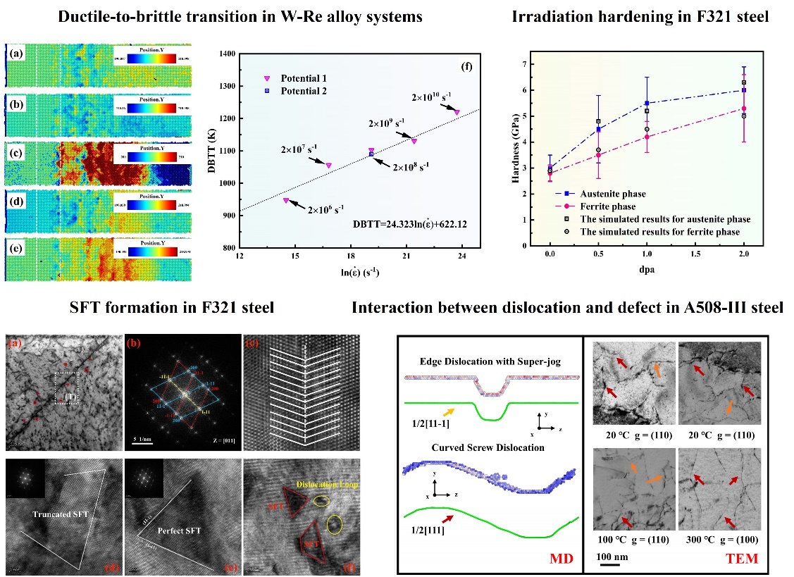 为揭示辐照硬化和脆化现象的微观机理,针对钨铼合金和铁基合金开展了系列研究,取得进展如下:(1)明确了Re元素和氦泡对钨基合金韧脆转变曲线的影响,分析了裂纹尖端断裂行为的潜在机制,建立了韧脆转变温度与应变率的关系,这加深了对钨基合金韧脆转变现象的认识,为提高材料的服役性能提供了新思路。(2)揭示了F321钢内奥氏体相中位错和辐照缺陷间的相互作用机制,建立了微观数据驱动的晶体塑性有限元模型。通过实验和模拟计算比较了F321钢内铁素体相和奥氏体相的辐照硬化效应和微观参数演化。(3)揭示了SFT形成的尺寸效应,明确了孪晶界和Frank位错环对SFT形成的影响,并给出了微观机理解释。更进一步地,提出了基于MD数据驱动的机器学习预测模型,成功建立了Ni和Cr元素含量与SFT临界尺寸间的关系。(4)给出了A508-Ⅲ钢内辐照缺陷表征参数与辐照剂量间的数学表达式,建立了微观-细观-宏观多尺度计算框架;提出了通过多尺度框架计算断裂韧性和韧脆转变温度的方法,计算了调整参考温度ART,为核电站的延寿提供了参考。