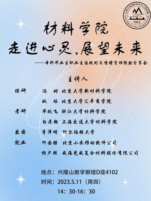 在出国留学方面,李泽明强调大家在准备雅思托福考试上一定要早下功夫,要提前规划好去哪个国家,不要盲目从众,要根据家庭实际情况和当地政策选择适合自己的学校;在就业方面,何国强、杨夕朋强调在求职过程中要学会展现专业技能,他们详细分析了材料专业本科生在制作简历、申请职位、笔试面试、洽谈薪资等方面应如何发挥专业优势,他们强调要以积极平和的心态对待求职过程中的成败,不要患得患失。