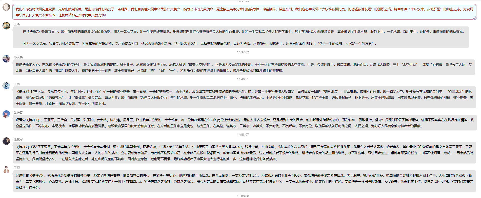 作为共产党员,我们要时刻警醒自己,不断提升党性修养和专业知识水平。支部党员被榜样们的先进事迹深深感动,苏放感慨道,作为新时代研究生党员,先辈们披荆斩棘,用血肉铺就了一条明路,我们肩负着实现中华民族伟大复兴,接力奋斗的光荣使命,更应接过英雄先辈们的接力棒,冲锋陷阵,浴血奋战。左帅认为,榜样之于人生,就如同炬火之于黑夜,灯塔之于航船,指南之于荒漠,立志为建功新时代、奋进新征程贡献青春力量。在学习榜样的过程中,要力争从自己做起,躬身践行,把榜样的力量转化为落实习近平总书记关于教育事业讲话精神的行动,充分发挥党员先锋模范作用。