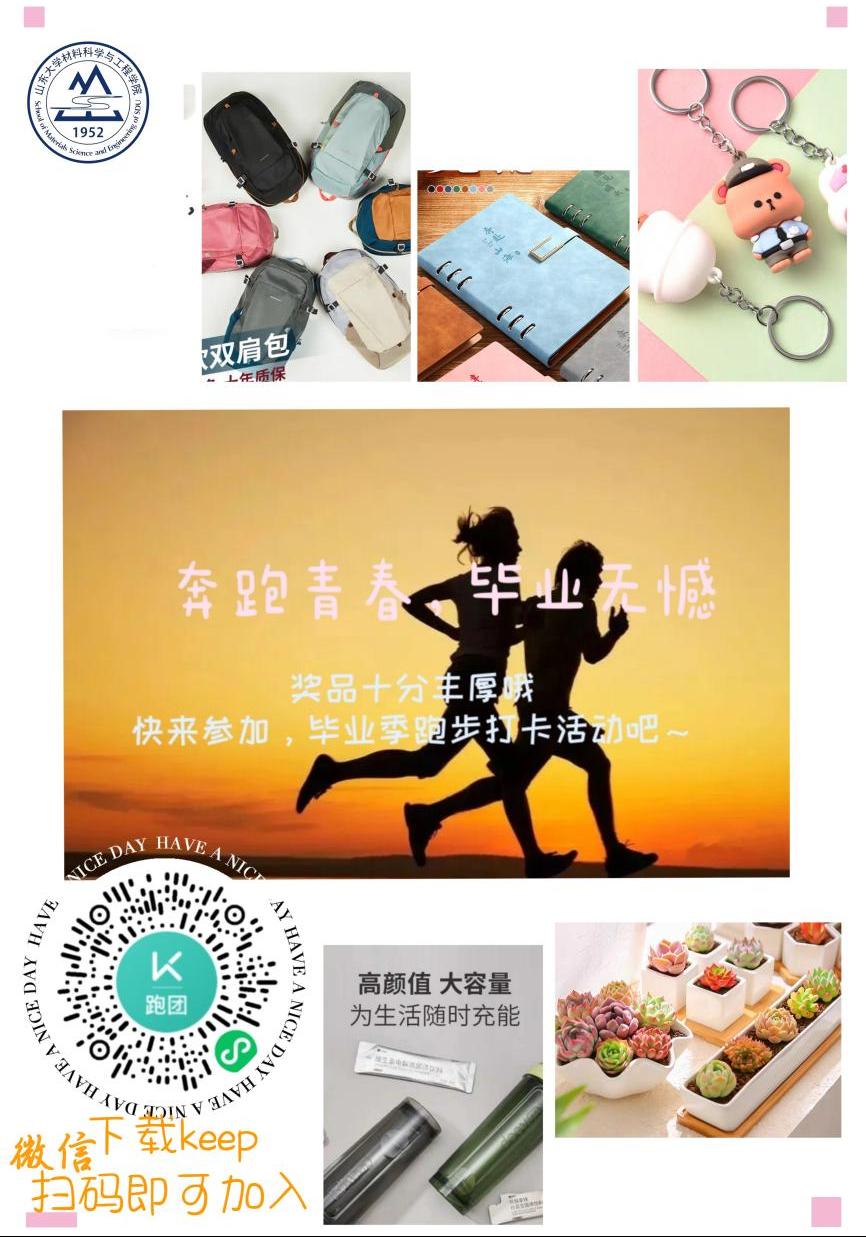 本次活动通过keep软件开展,根据参与者总跑步量以及打卡次数多少分别设立一、二、三等奖及参与奖,旨在引导学生养成科学锻炼的习惯,通过适量运动切实增强身体素质。作为毕业季系列活动中的第一站,材子材女们热烈支持、积极参与,近60多名同学在兴隆山风雨操场中挥洒汗水、释放活力,充分展现了当代大学生的青春风采。整个活动持续18天,最终选出一、二、三等奖共10名、参与奖共12名。颁奖仪式于27日晚在综合实验楼顺利举行,获奖同学分别获得了迪卡侬双肩包、keep摇摇杯、卡通手链、多肉盆栽等精美礼品。