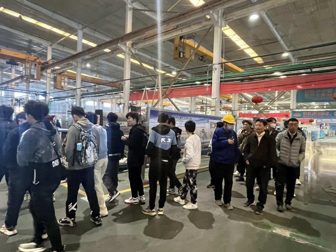 在泰开集团有限公司全封闭变压器壳体车间,同学们了解了钨极氩弧焊、变极性等离子电弧焊以及螺旋焊等焊接工艺方法和装备,参观了高强铝质壳体从原料切割、焊接制造、表面处理到质量检验的生产工序;在变压器组装现场,同学们熟悉了电力变压器的种类、各种壳体结构的适用场合,并对比分析了不同类型变压器的特点及使用寿命。通过本次企业参观,同学们了解到高压开关产品主要应用于国家高压电领域,是一种制造精密的大型仪器,对焊接质量的要求极高。公司人员指出,变压器一些复杂的焊缝需要人工完成以至生产效率相对较低,是目前生产的最大痛点之一。班主任老师鼓励同学们能够认真学好专业知识,希望通过实习实践,将专业理论知识应用于产品生产中,并且勇攀科研高峰,争取攻破行业卡脖子技术难题,解决生产上的实际问题,为社会发展做出贡献。