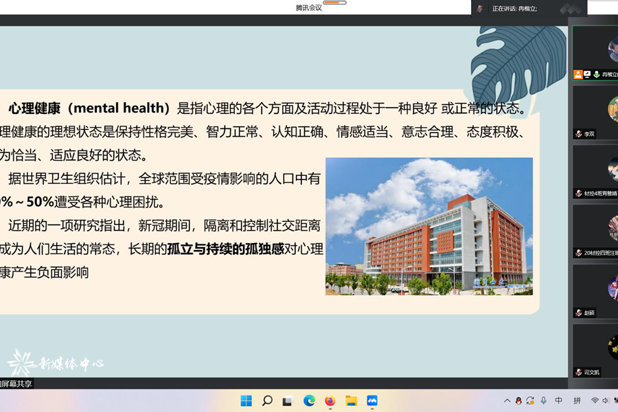 5月14日晚7时,材料科学与工程学院20级材控四班成功进行了一次线上心理健康主题班会,本次班会由班长冉楷立主持,材控四班全体学生参与。