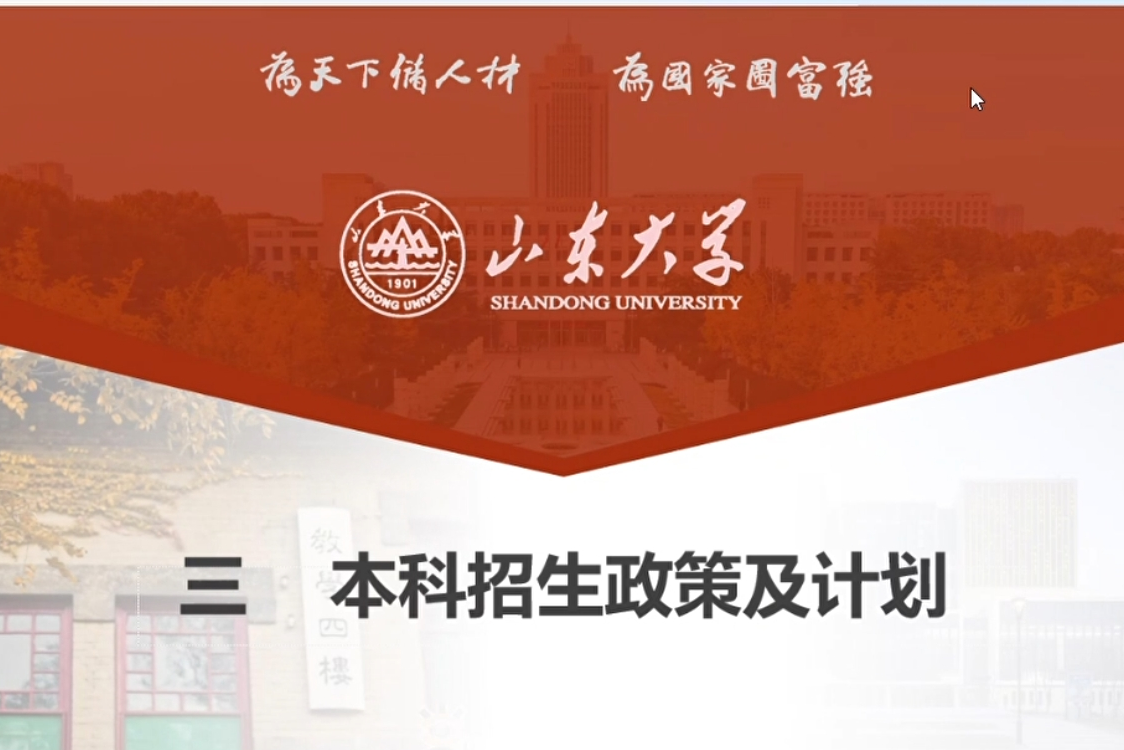 接下来,来自“启航山大”团队的崔宇鑫介绍了山东大学的招生政策和2021年的招生情况。首先,他就学校招生计划、招生类型和招生专业进行讲解;随后,就加分政策、投档比例、专业分配原则等录取原则进行介绍;最后,就校内转专业规定、特殊类型的招生和人才培养模式等进行说明,并用详实的数据展现了山东大学2021年在山西的招生情况。该部分宣讲以团队对高三学子真诚的祝福结束。