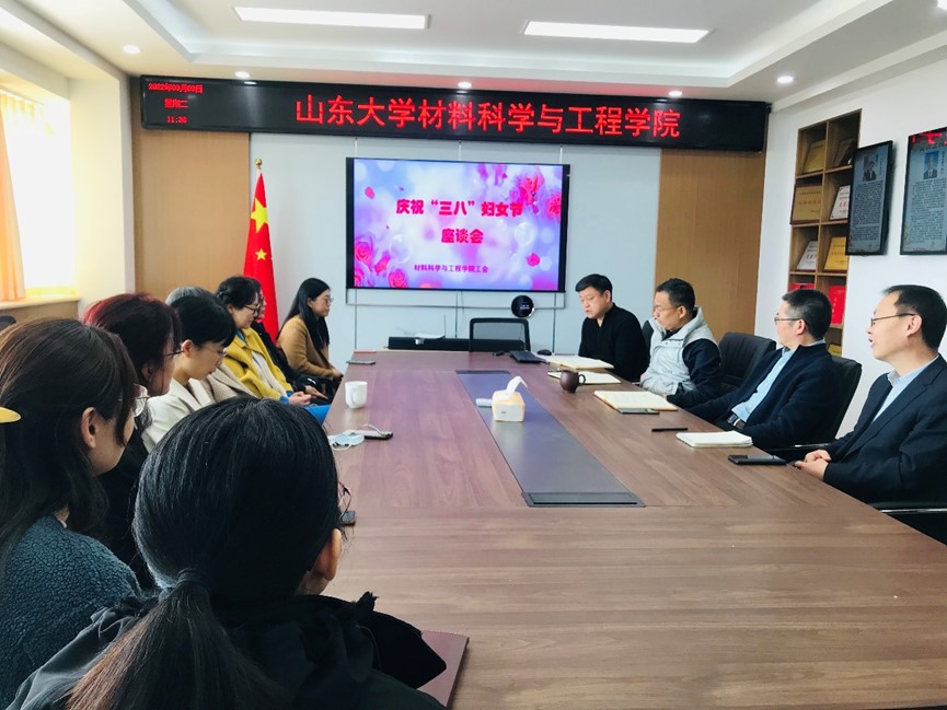 38日上午,材料学院党委书记崇学文、常务副院长吕宇鹏、党委副书记吕伟、工会主席张力勇在千佛山校区主楼915民盟会议室同学院女职工代表进行交流座谈活动。
