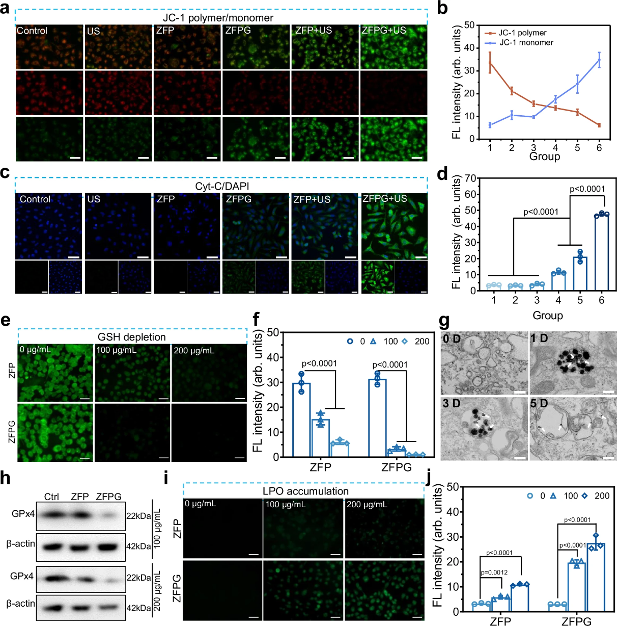 图2.(a)经不同处理后的PC-3细胞的线粒体膜电位变化,比例尺50 μm。(b)JC-1聚集体和JC-1单体荧光强度统计。(c-d)经不同处理后的PC-3细胞Cyt-C释放以及荧光强度统计结果,比例尺50 μm。(e-f)荧光图像和强度显示与ZFP和ZFPG NPs共孵育24 h的PC-3细胞内的GSH水平,比例尺50 μm。(g)ZFPG与PC-3细胞共孵育不同时间点后的bio-TEM图像。(h)与不同浓度的ZFP和ZFPG共孵育后的PC-3细胞的GPx4表达情况。(i-j)荧光图像和强度显示与ZFP和ZFPG NPs共孵育24 h的PC-3细胞内的LPO水平,比例尺50 μm。