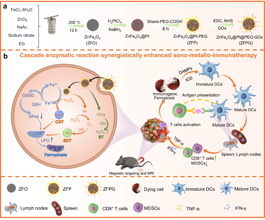 免疫治疗在临床应用中面临着几个严峻的挑战,包括低免疫应答率、免疫抑制性肿瘤微环境(TME)和显著的免疫相关不良事件。通过抗癌药物诱导细胞凋亡是引发抗肿瘤免疫治疗反应的一种重要策略。不幸的是,它通常被认为是一种免疫耐受的细胞死亡形式,因为巨噬细胞吞噬凋亡肿瘤细胞可以增强TME内的免疫抑制并防止刺激宿主免疫系统。设计具有类酶活性的纳米酶来诱导肿瘤内部活性氧(ROS)爆发,增强细胞内脂质过氧化物的(LPO)积累,诱导免疫原性铁死亡,为克服免疫抑制TME和增强免疫应答提供了一种新型的策略。然而,TME的高度异质性严重限制了单一酶活性的纳米酶诱导免疫原性铁死亡的能力,通过设计集成多酶活性于一体的纳米酶,实现级联催化反应,有望打破肿瘤稳态并克服TME免疫抑制状态。针对这一难题,研究团队开发了一种具有ZnFe2O4@Pt核心和葡萄糖氧化酶(GOx)壳的ZFPG纳米颗粒(ZFPG NPs)用于前列腺癌的超声金属免疫治疗。ZFPG NPs具有五种酶活性(类过氧化物酶、类过氧化氢酶、类氧化物酶、类谷胱甘肽过氧化物酶和GOx)、良好的声敏性能和显著的磁靶向特性。这项研究为纳米酶的设计和克服传统免疫治疗局限性方面提供了良好的范例(图1)。
