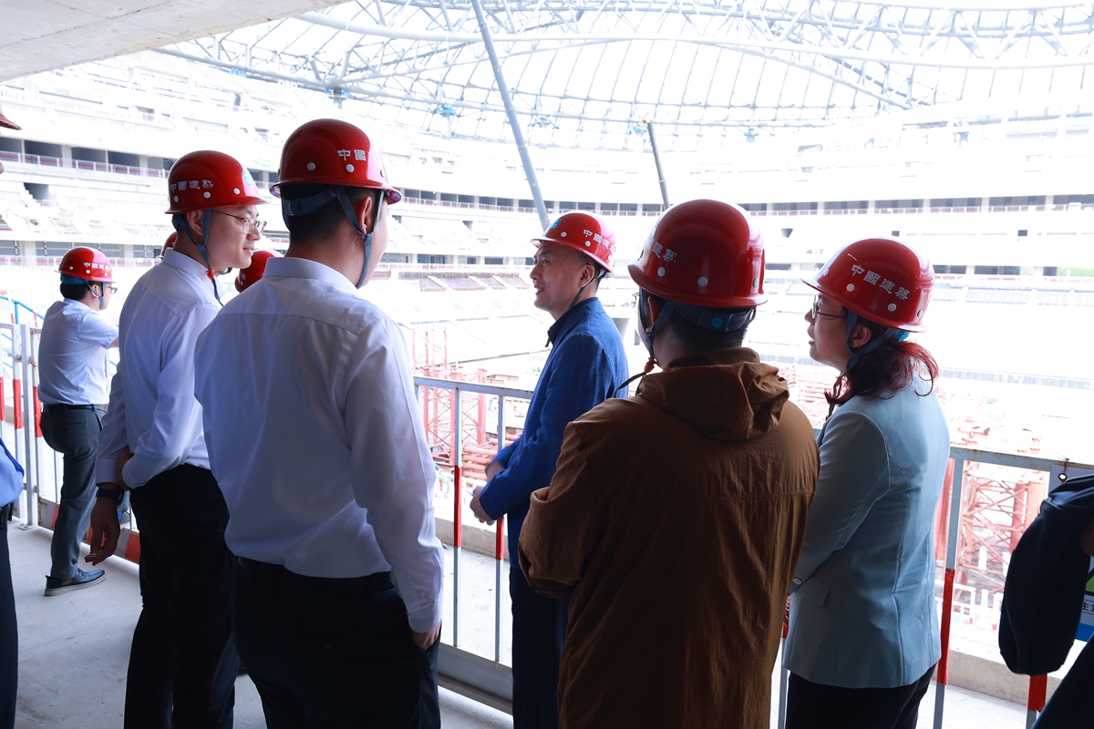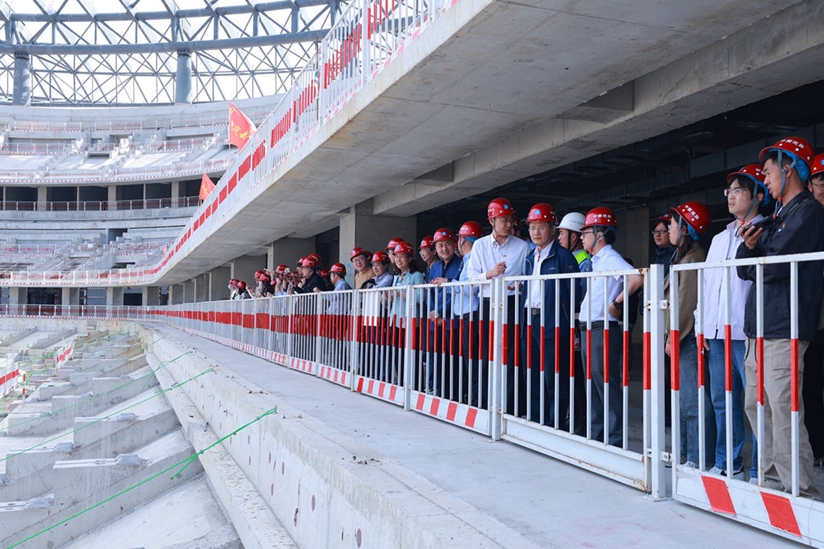 走进建设一线,触摸科技力量。随后,师生们实地探访了中建八一承建的现代化足球体育场馆施工现场。项目负责人讲解了场馆“双曲面钢结构+光伏一体化屋面”的设计理念与施工难点,强调其“绿色低碳、智慧运维”的可持续特色。师生们近距离观摩了高性能混凝土、轻量化合金等新材料在工程中的创新应用,深刻体会到“材料科学赋能建筑革新”的实践价值。
