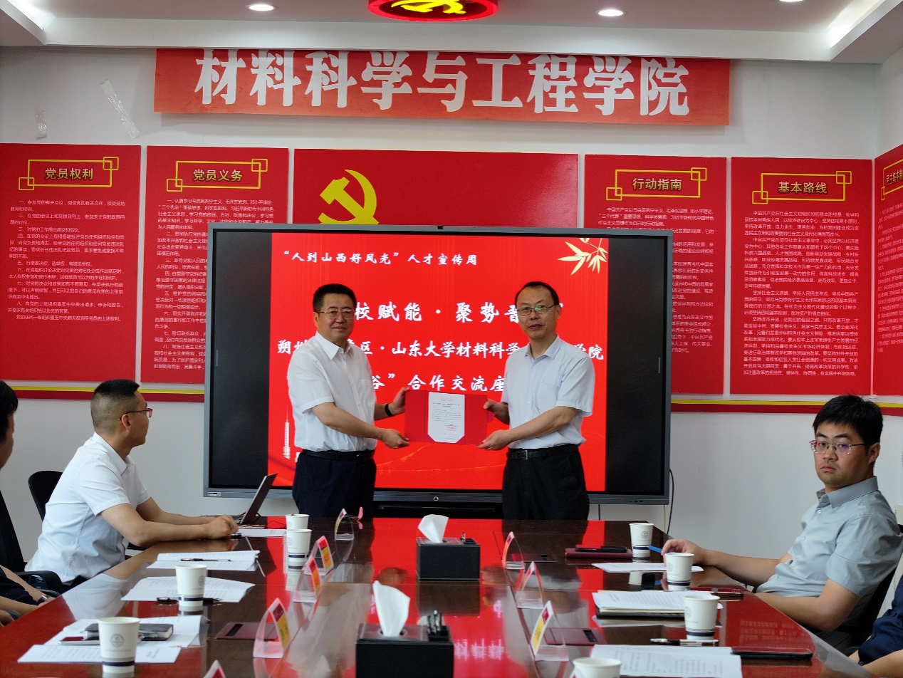 5月27日上午,山东大学材料学院与山西省朔州市平鲁区人民政府校地合作对接交流会在山东大学千佛山校区党员之家成功举行。双方围绕工业陶瓷领域技术合作、人才协同培养和驻“晋创谷·朔州”平台开展成果转化等内容开展深入交流,共探校地融合新路径。