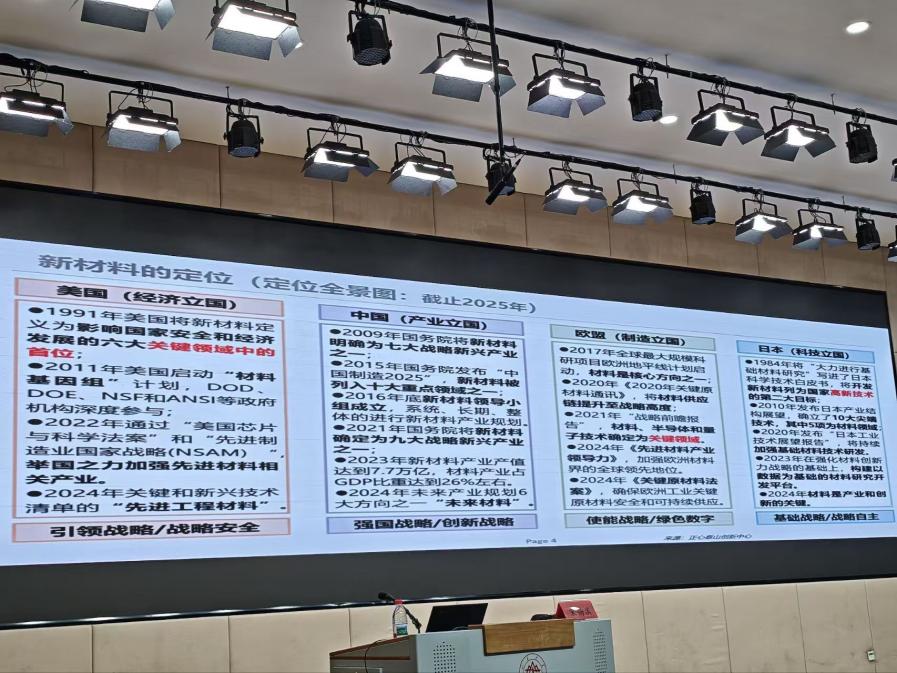 随后,宋老师以“新材料的定位”为核心切入点,通过2025年新材料定位全景图,系统梳理了美国、中国、欧盟及日本在新材料领域的战略布局与发展特色。材料是科技变革的核心力量,更是各国抢占未来发展先机的关键赛道。宋老师在讲座中强调,从全球视角来看,新材料已成为国家安全、经济发展与产业升级的重要支撑,各国基于自身国情形成的差异化战略布局,也为新材料的多元化发展提供了思路。现场听众围绕新材料技术突破、产业落地等问题与宋老师展开互动,讲座氛围热烈,引发了大家对材料科技发展的深入思考。