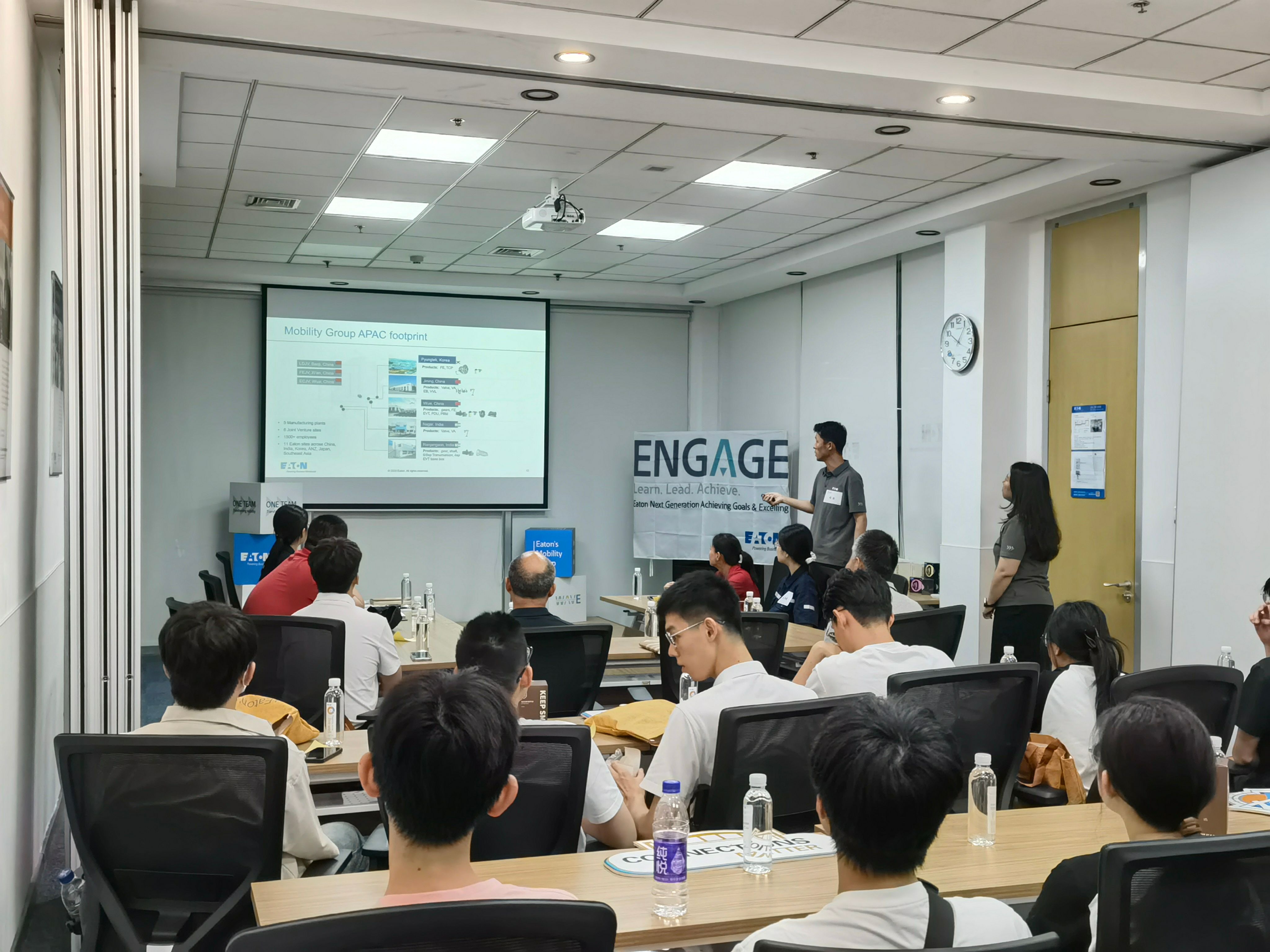 活动伊始,伊顿公司亚太区CI经理程浩图文并茂地向师生们进行了企业宣讲,着重介绍了伊顿公司的发展历程、主营业务和校企合作开展情况,全英版本的幻灯片也体现出外资企业独特的企业文化,讲述期间主讲人通过互动提问的方式快速点燃了现场同学的参与热情。