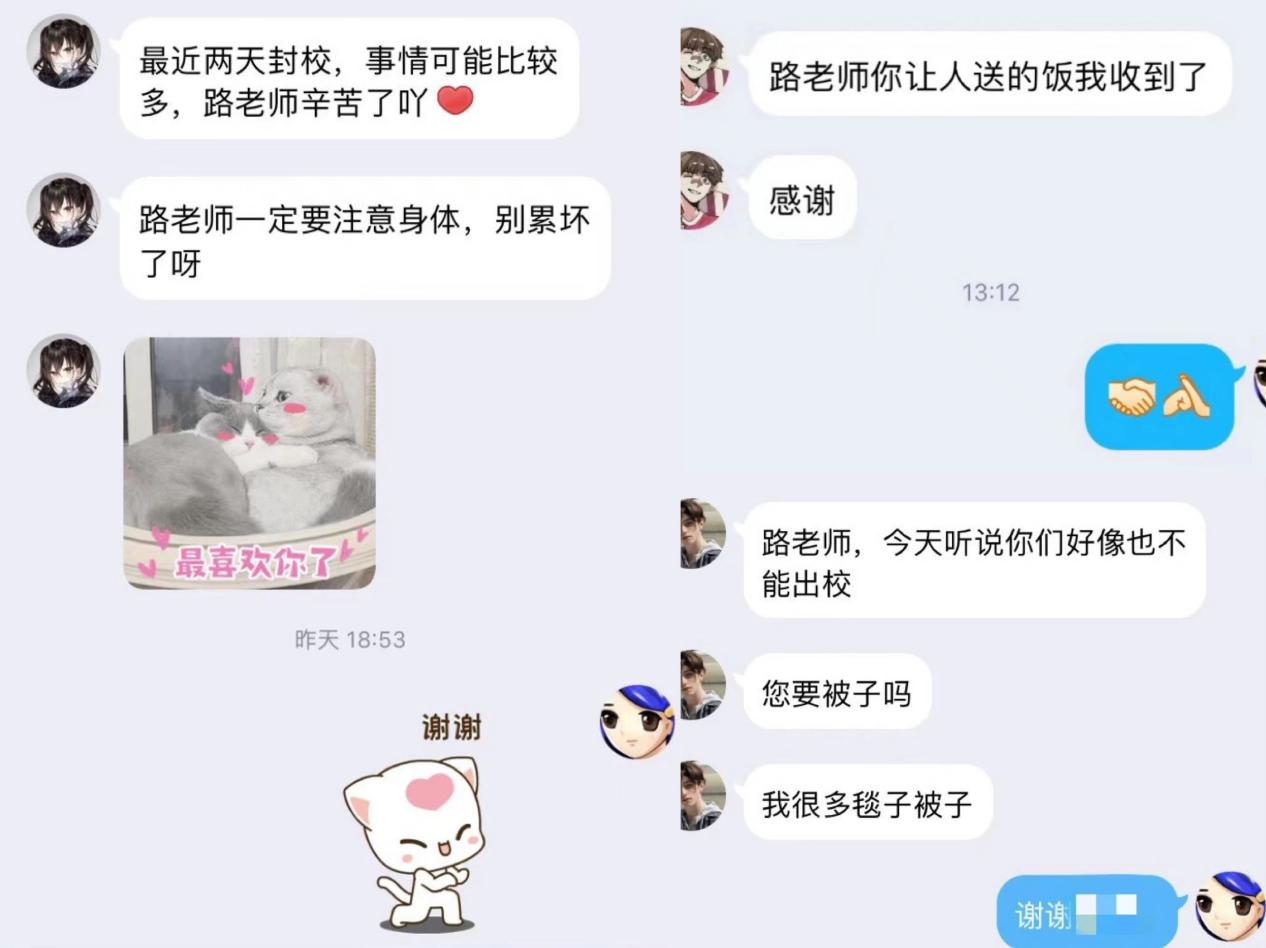 线下走访慰问,传递关怀温暖。学院党委副书记、副院长和辅导员走进宿舍,面对面与学生谈心谈话,询问毕业设计、线上课程等学习状况,关注日常生活需求,对学院临时党支部成员和志愿者表达关怀与感谢。同时,学院安排志愿者为在校医院进行隔离的发烧学生送饭和生活用品,让同学感受家一般的温暖。