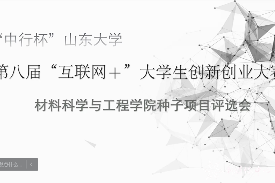 3月8日晚7时至8时,材料科学与工程学院利用腾讯会议在线上成功举办了“中行杯”山东大学第八届“互联网+”大学生创新创业大赛材料科学与工程学院种子项目评选会。本次会议由2021级材料7班李媛婧同学主持,共有八支队伍参加了本次答辩。